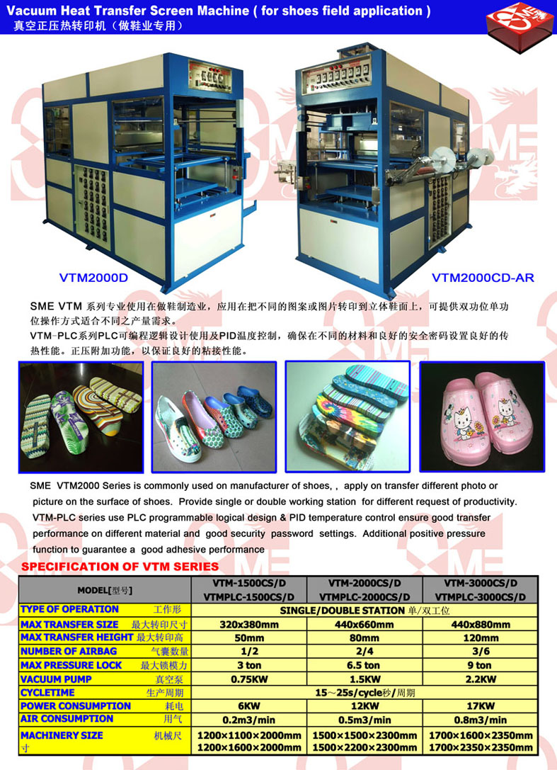 本工藝可解決在立體/曲面的產(chǎn)品表面上(如:筆記本計(jì)算機(jī)、i-phone、塑料產(chǎn)品外殼、行李箱,MP4,EVA花園鞋、人字拖鞋、涼鞋、不同材質(zhì)的休閑鞋)印刷圖案,通過(guò)此-立體真空熱轉(zhuǎn)印機(jī)械-將轉(zhuǎn)印膜上的精美平面圖像..清晰亮麗地展現(xiàn)出來(lái)。這新技術(shù)可幫助顧客節(jié)省費(fèi)用和得到最優(yōu)秀與最耐久的圖像。